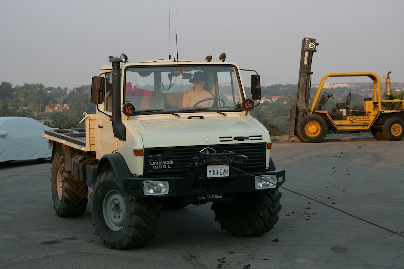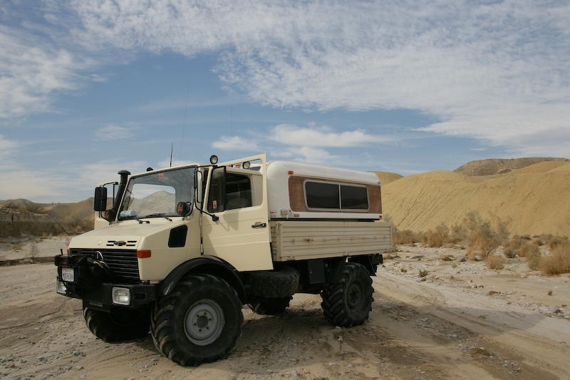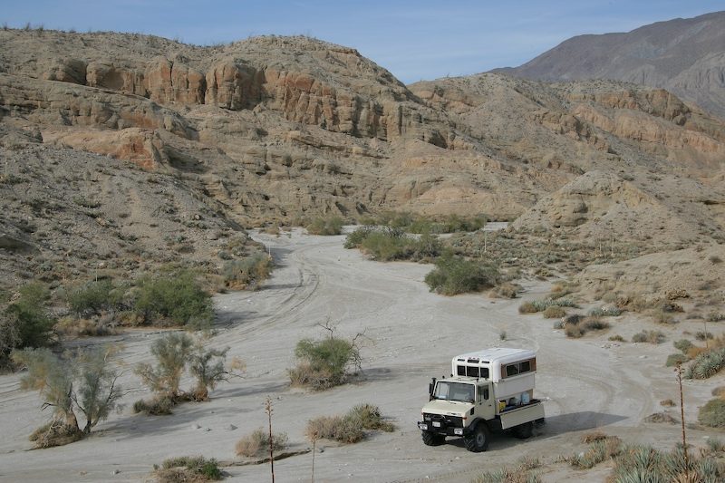 After many weeks of effort, we were finally ready for a field test. We checked the weather and were promised a nice hot day in the desert, so we paced our stuff and left. Our destination was Fish Creek Wash in the Anza-Borrego Desert State Park east of San Diego. The photo above shows the Unimog with camper attached in the "travel configuration" with the top lowered.