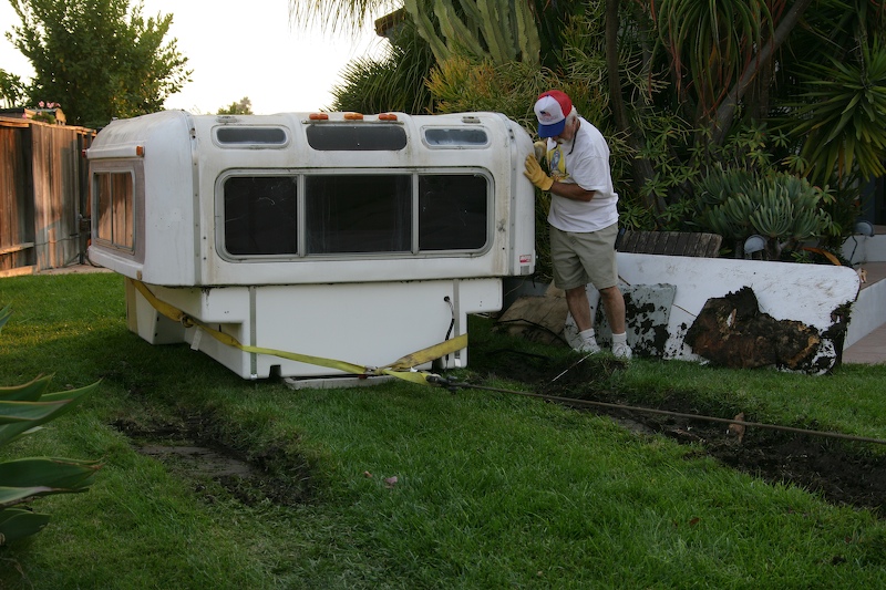 We finally gave up on using the forklift to get the camper out of the back yard. We built a ramp and then used the winch to skid the camper down the ramp onto the ground from the saw horses it had been on for the previous 3 years. Then, we winched it out to the front yard. As a side note, the camper weighs 2,000 pounds, plus or minus a bit according to the manufacturer's specifications. Here, Kathleen operates the hydraulic winch in the mog.