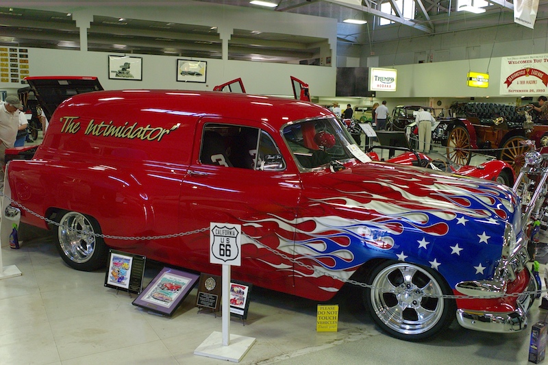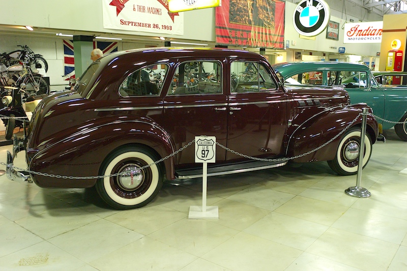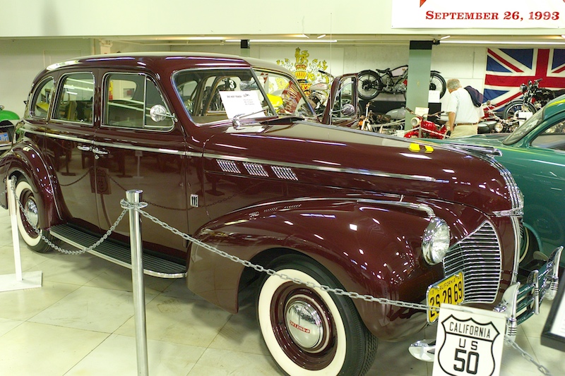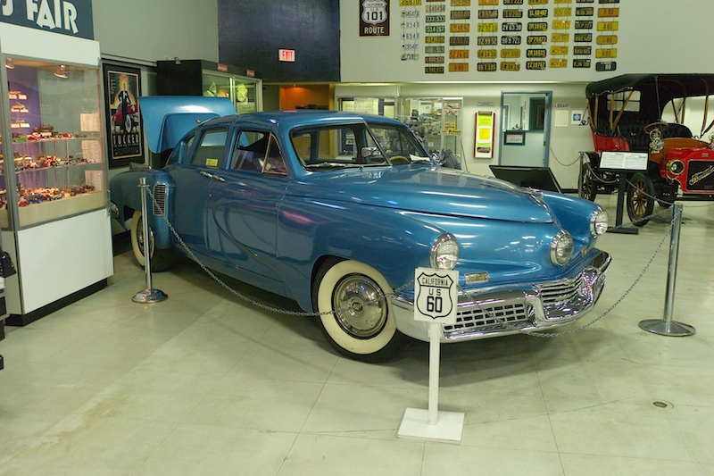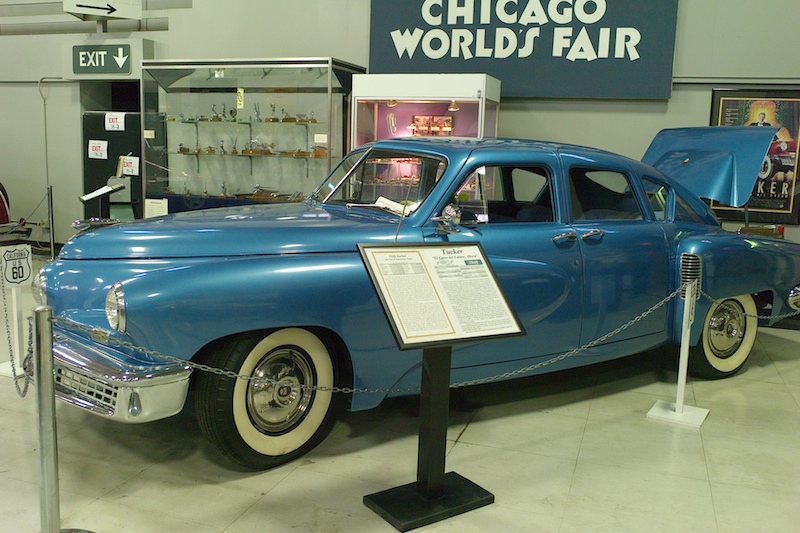 Another view of the Tucker. This car was very innovative for its time and employed features that are still common today. The vehicle had a rear engine and was powered by a modified helicopter engine.