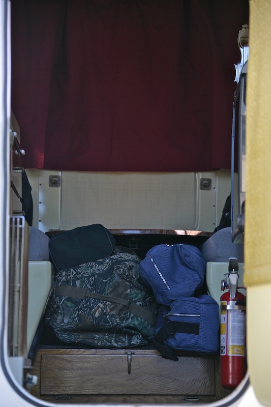 One of the bad by-products of adding the camper was the loss of cargo space. We regained some of it with the roof rack, but mostly we just elected to load it into the main living space and then unload it when we reached camp. Here you can see all the necessities for a modern camp -- sleeping bags, folding chairs, folding table, recliner, etc. What is missing is the beer.