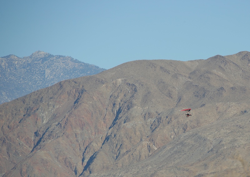 We had a great day of riding. My only complaint was that there was so little wind that the dust from the riding hung in the air impacting your ability to see the trail. We had a great dinner that included Kathleen's from-scratch home made bread in the dutch oven. While cold, the night was calm and we all slept well since we were tired from riding. In the morning, we awoke to an odd buzzing. I went outside with the camera and caught this ultra light circling our position. In the photo above, 8,000 foot Toro Peak is visible in the left of the frame.