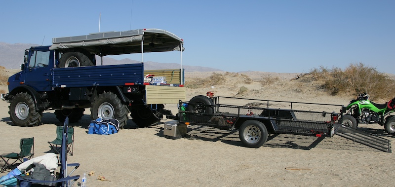We solved the beer dilemma by putting the cooler on our trailer along with the quads. In getting to the camp site, I came in later at night than Kai. I went too far and ended up traveling in a wash. When we spotted him, he said "turn right", which I did. But, it involved coming up a 5 foot embankment to get to the camp site without backing up in the dark with the trailer. I failed to have the differential lock engaged on the first attempt, but made it on the second try. Not too bad given the height of the embankment and the fact that I was pulling a full size car-carrier trailer and 2 quads. To make setup easier, I jack-knifed the trailer so we could use the stairs without having to uncouple the trailer. This worked fine but you have to be careful about going too far and ramming the spare tire against the frame of the truck.