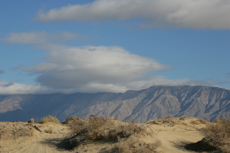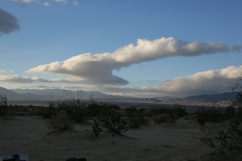 The next day was "just another day in paradise" with lots of riding followed by beer, wine and plenty of good eats. Later in the evening, the wind started to blow. We had heard from friends that a weather front was approaching. The winds were strong all night, but the skies were clear. In the morning, we could see the cloud banks handing on the Laguna Mountains to our west. The high winds were generating interesting cloud formations over the crests of the peaks. I shot the interesting cloud formation above to the south of our position in the Borrego Valley.