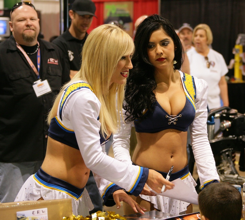 Speaking of bumps, several of the "Charger Girls" were working one of the booths. Needless to say, they were getting tons of attention from the mostly-male crowd. Look at the smile of that fellow in the rear. The blonde "gets" working a crowd, the other one less so.