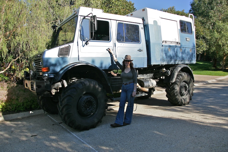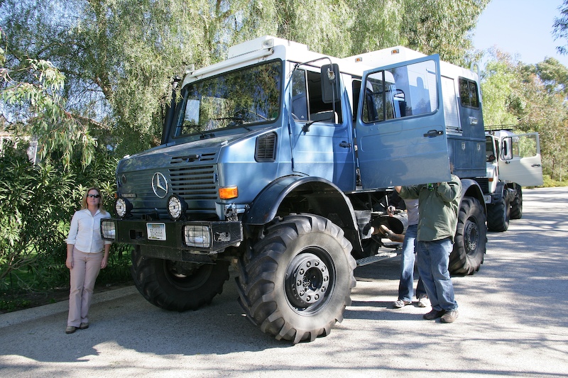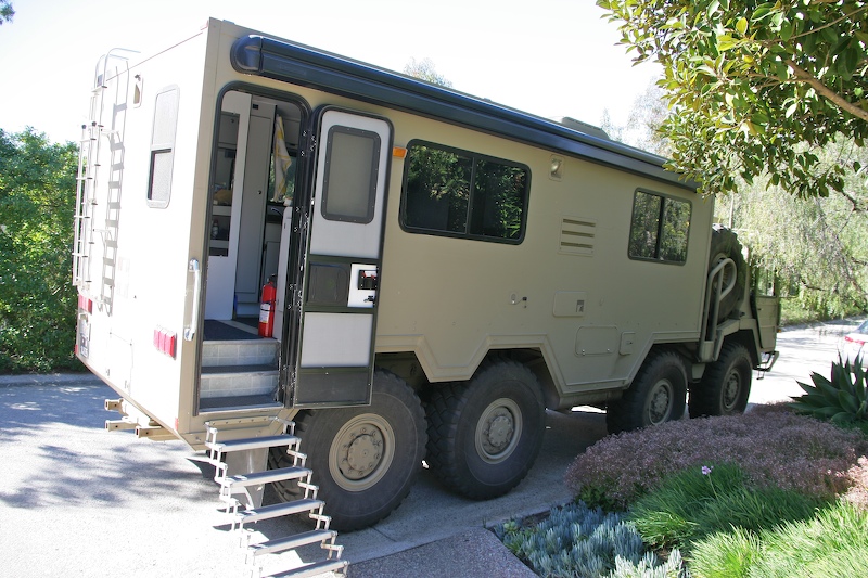 To provide a sense of scale, that is a normal height person at the left. I am guessing that this rig is at least 2 feet taller than my truck, excluding the A/C box on the roof. My 1300 is in the back and you can see both the camper and the roof rack.