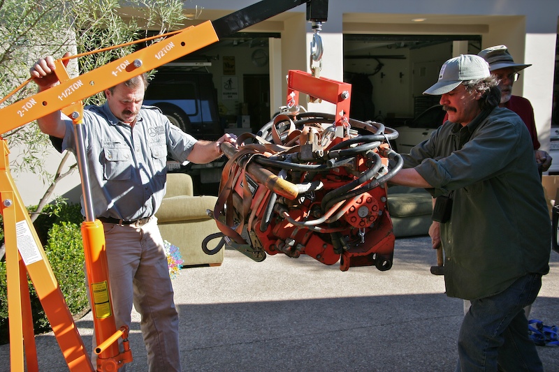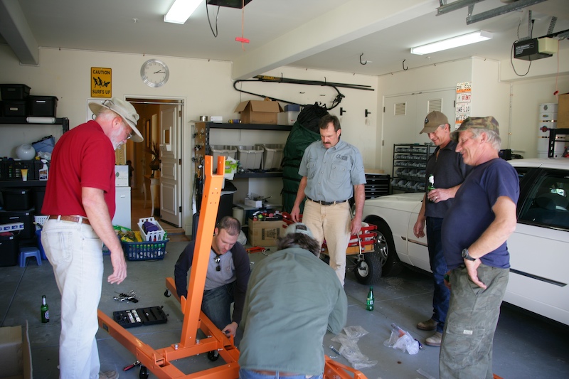 The second objective of the gathering was to amass sufficient manpower to remove a BAW from the front of John's 1450. To do that requires an engine hoist, but since it came in a box it had to be assembled. Here the crew applies collective wisdom to get the job done (that means one worker, 3 supervisors and several beer drinkers).
