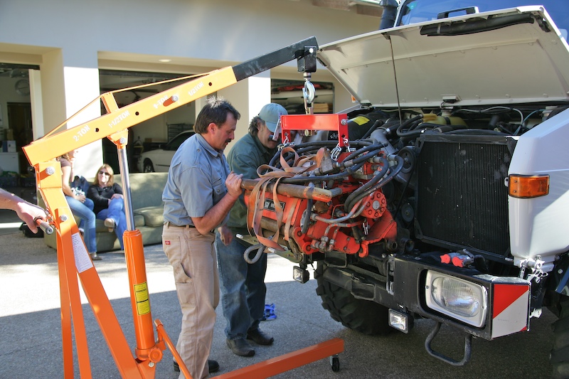 The BAW before removal. This fellow is big, perhaps 1,000 pounds including the cable and hoses. John brought the winch from Georgia from Sean Philyaw, a well-known and respected supplier of Unimogs.