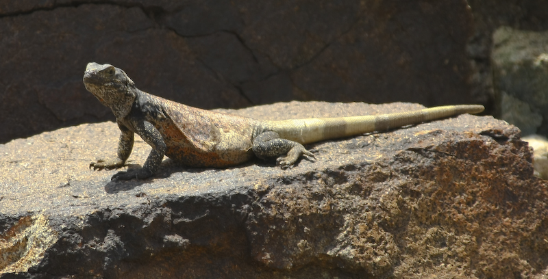 Close by, we spotted another chuckawalla. This guy was very well fed. The native americans ate these lizards. When threatened, the chuckawallas run into a crack in the rocks and then blow themselves up to prevent extraction by predators. The indians used a stick with a hook on the end to remove them for dinner.