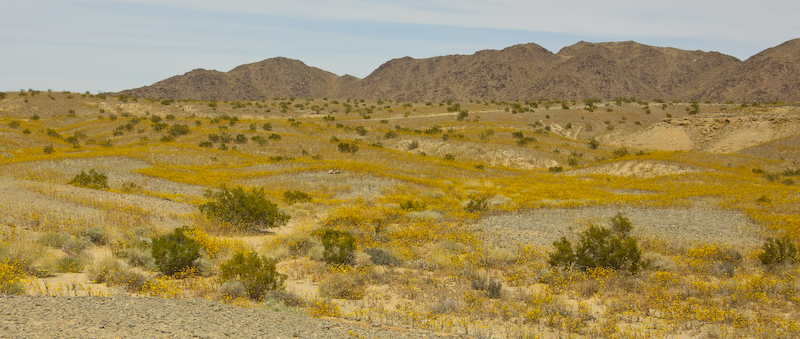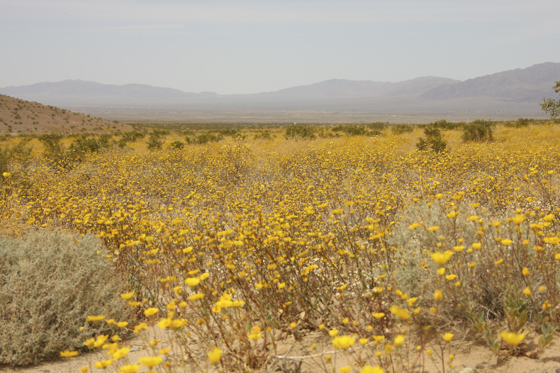 Crossing another low pass we again were presented with expansive views of the wild flowers in bloom. The structures in the distance are along the 29 Palms highway.