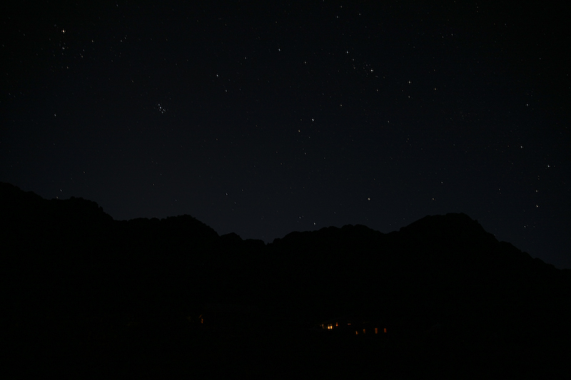 The night was clear and cold. The stars were bright, but there was no moon. I thought there was sufficient light for a time exposure, but was proven wrong. The shot above is a 30 second exposure and the outline of the Providence Mountains is barely visible. The lights in the foreground are the cave caretaker's cabin.