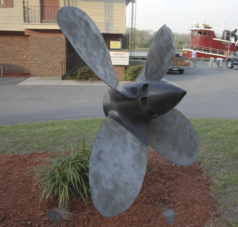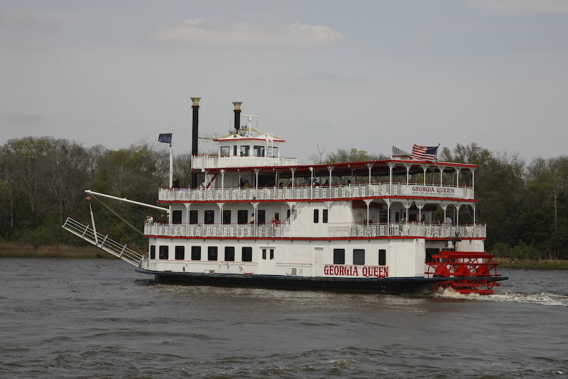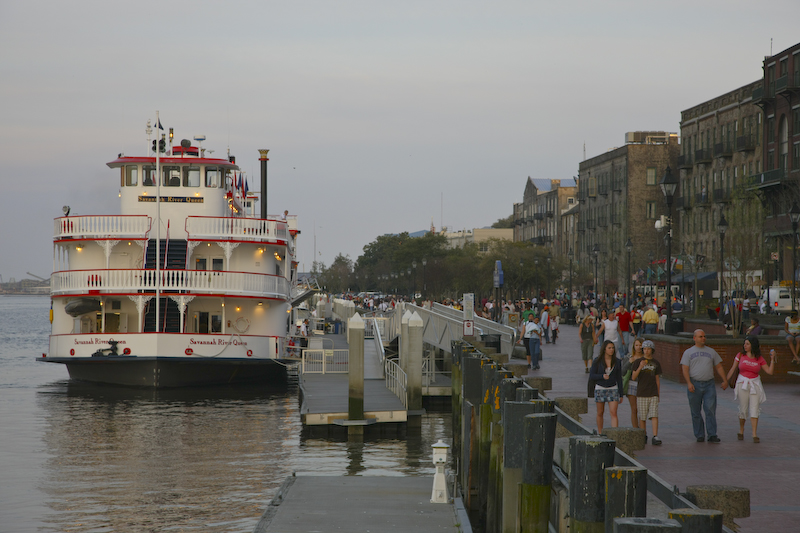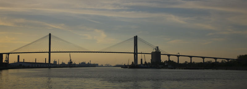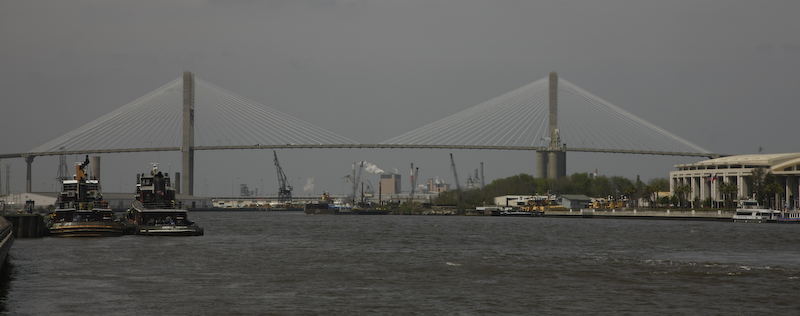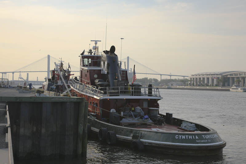 There was a commercial tug boat dock next to the tourist area. The large suspension bridge that spans the Savannah River is visible in the background.