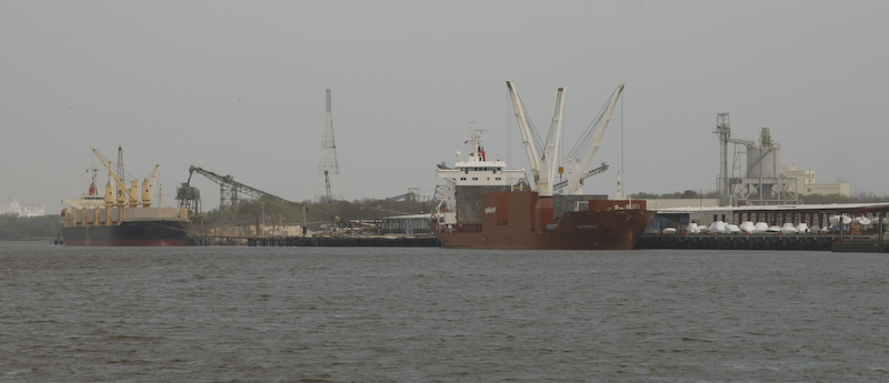 During the night, another cargo ship docked at the facility just down river from the hotel. The ship in the foreground was not there the previous afternoon.