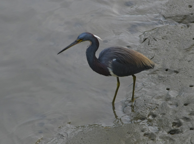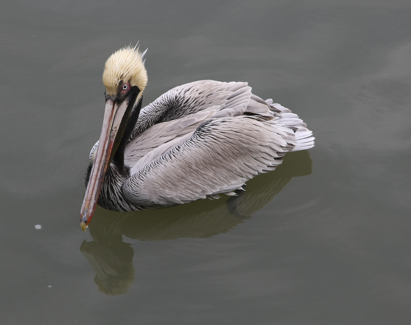 One of the local pelicans got close enough for a pretty clear shot. Note the reflection in the calm water.