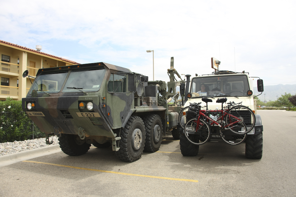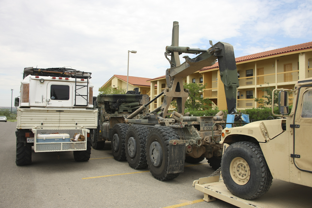 The boys from Fort Bliss had equipment at the restaurant on display as part of some thing that they were supporting. So, naturally, since all guys want to know "who's is bigger", I decided to find out. The Oshkosh on the left is an 10X10 vehicle used for container transport. 4 steering wheels in the front, 6 in the back.