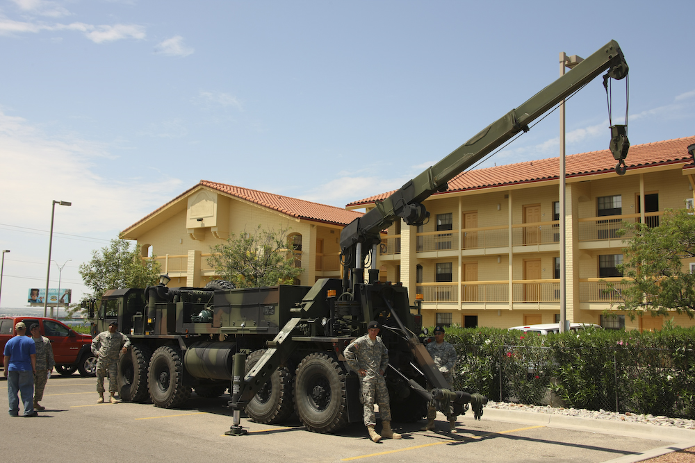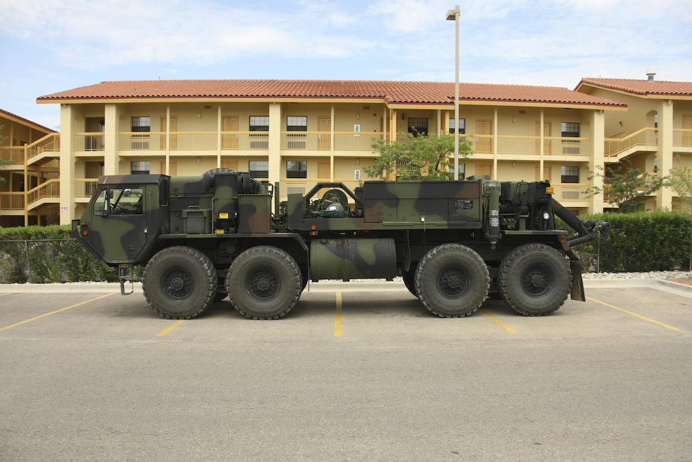 This is an 8X8 wrecker-recovery vehicle. Later, the operator would put out the outriggers and raise the crane.