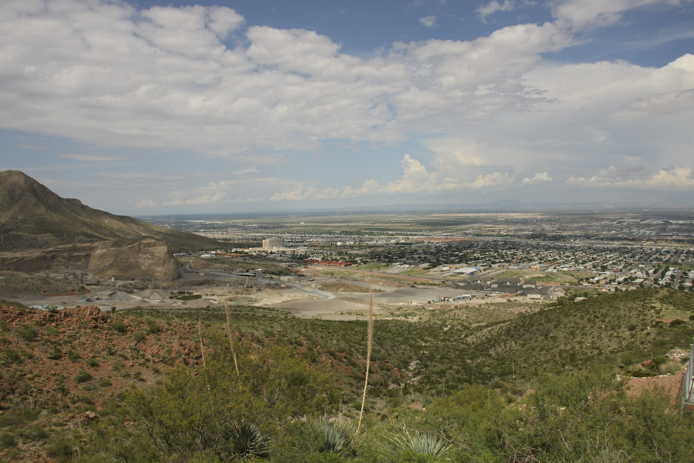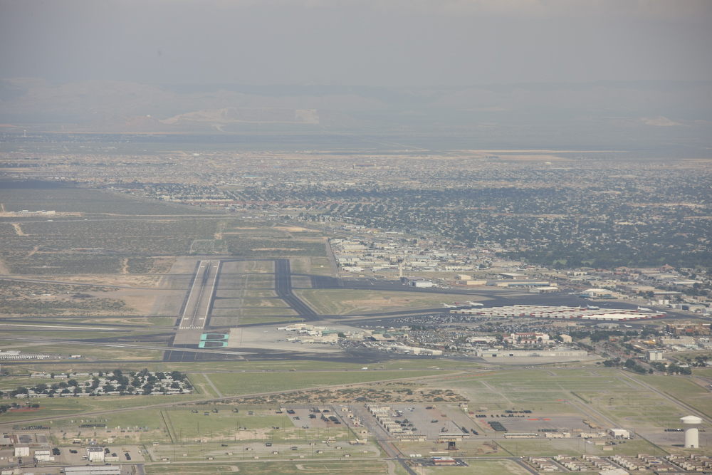 To the east, you can see the El Paso regional airport. In the hills beyond, lie the Hueco Tanks, our next destination.