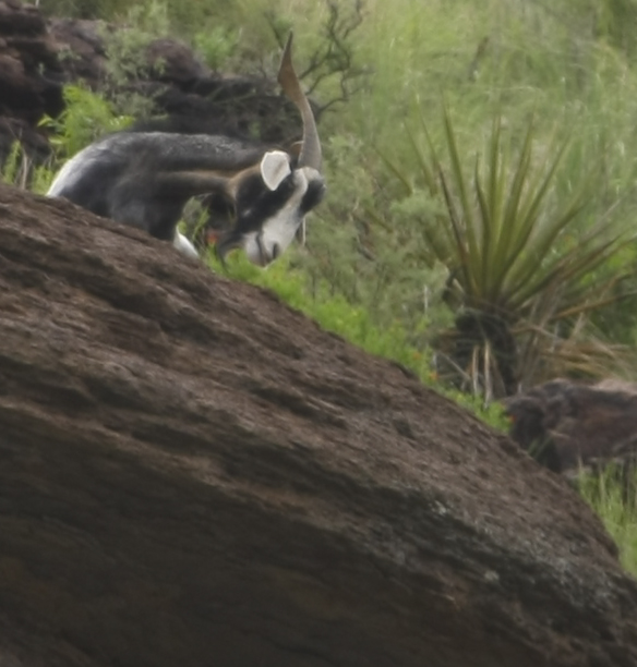 Kathleen spotted something on the hill above the road and shot this photo as we were driving by. It is blurry due to the motion of the mog, but the animal is clearly some kind of odd goat. Note the twisted horns.