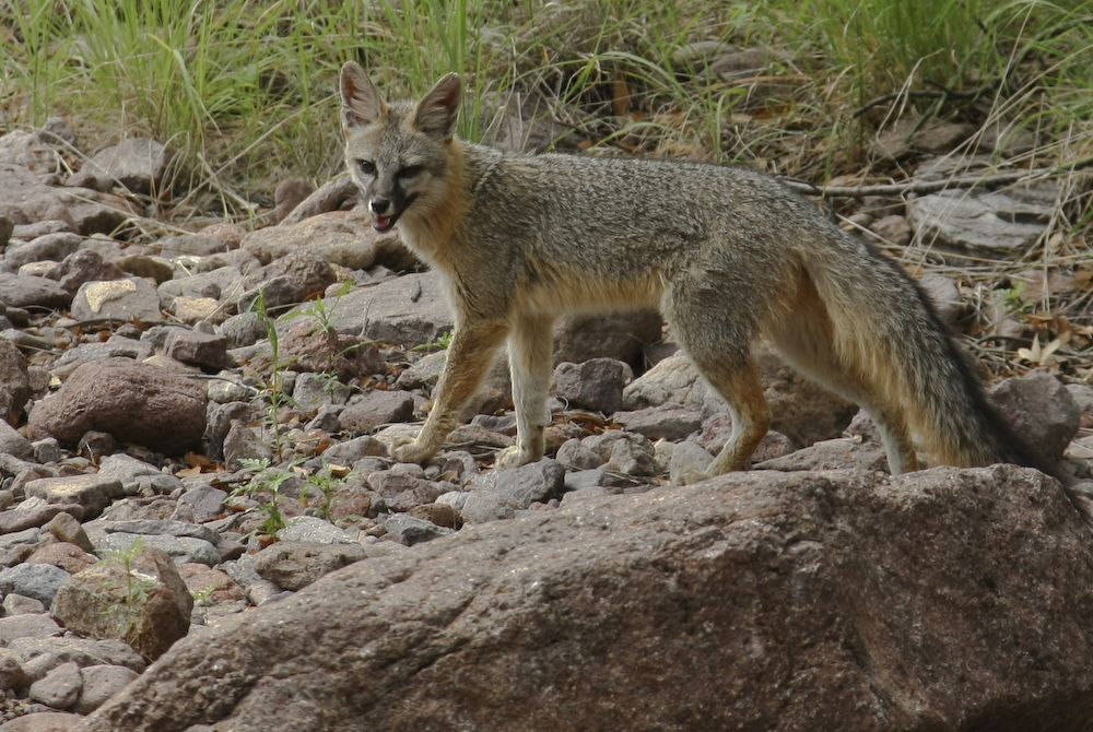 After we set up camp, I was sitting quietly drinking a cocktail when I saw something move out of the corner of my eye. I snagged my camera and caught this shot of a fox working the wash and marking its territory.