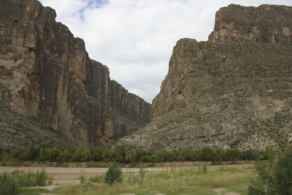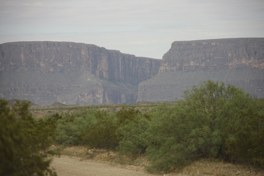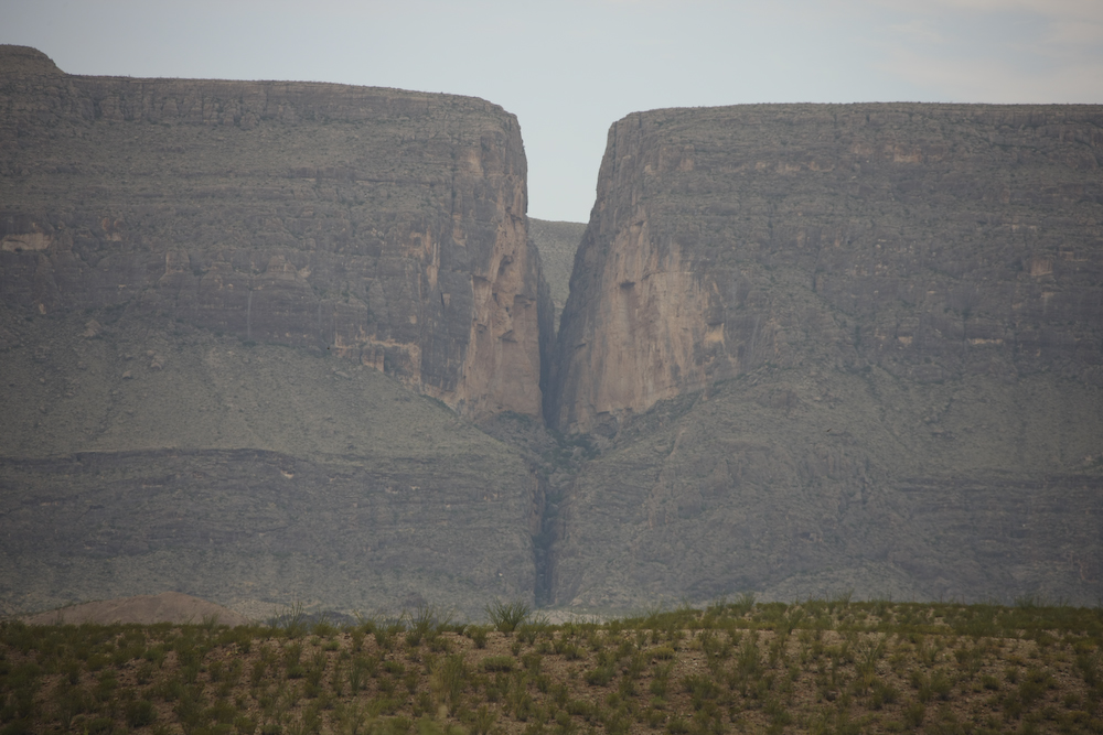 The mouth to Santa Elena canyon. The Rio Grande comes through the slot in the cliff. The river held its course while the uplift occurred allowing the river to cut through the cliff like a knife. Along the base of the cliffs runs Terlingua Creek.
