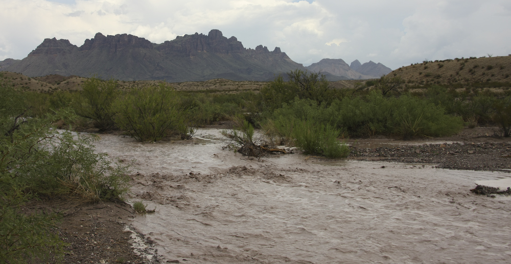 We spent a night in a motel in Terlingua, TX because it was too hot to stay in the camper comfortably. The motel was basic and besides air conditioning, it offered protection from the wind storm that we had that night. Thunderheads had been building all day, and the rain and wind finally came around sunset. After leaving the motel, the plan was to travel the dirt road that crosses the Big Bend National Park along the Rio Grande river. The road is perhaps 60 miles long and during our travels we did not see another vehicle. Along, the way we were challenged by a flash flood due to the rains in the Chisos Mountains to the north. The photos below are what we saw.