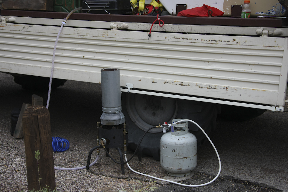 Our hot shower setup. I fabricated the heater and it REALLY works. You HAVE to leave the water on or it will boil in the copper tubes and scald you. The burner was taken from a 75,000 BTU camp stove. The system uses the water pump in the camper and the camper's water supply. It generates both high temperature and high flow. Just like home, except for the wind.