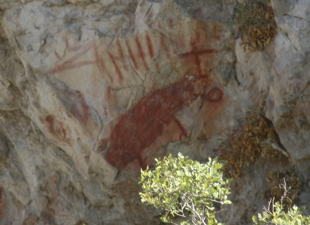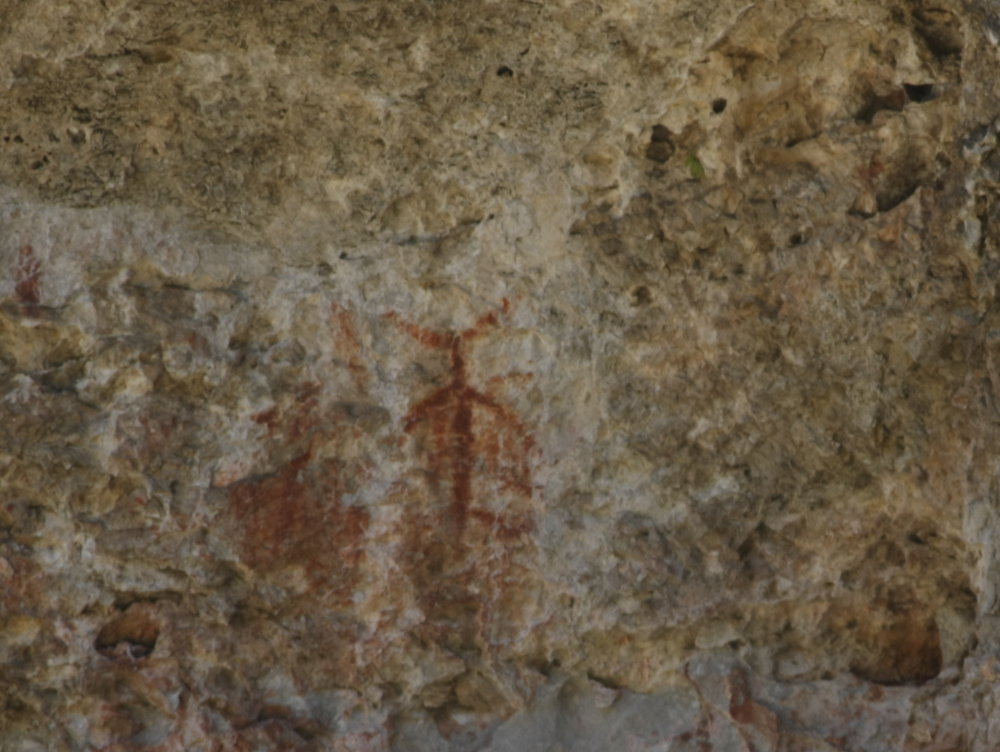 The finer details of the pictographs were obscured by the shadows of the overhanging cliff.