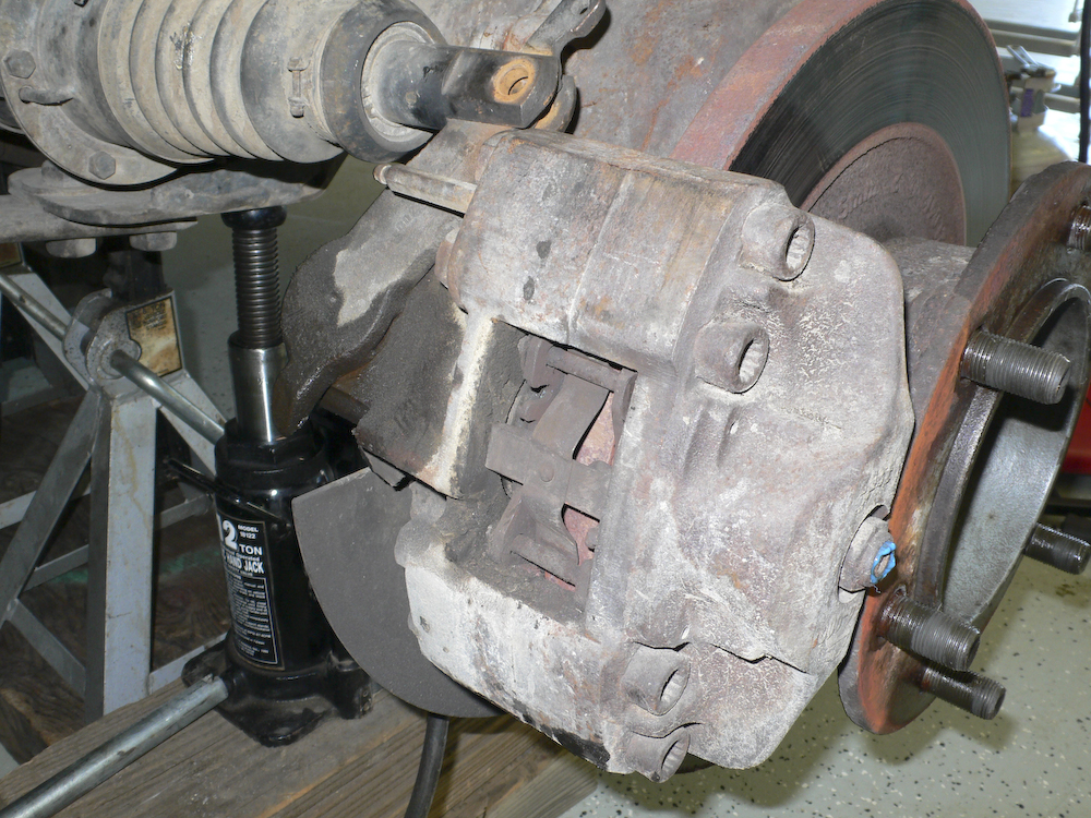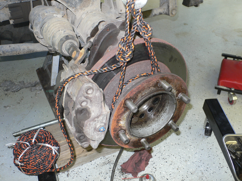 The brake caliper assembly was supported by baling wire to prevent kinking of the lines when the assembly is unbolted from the hub. The bottom bolt was a zero clearance bolt and was really, REALLY hard to get out.