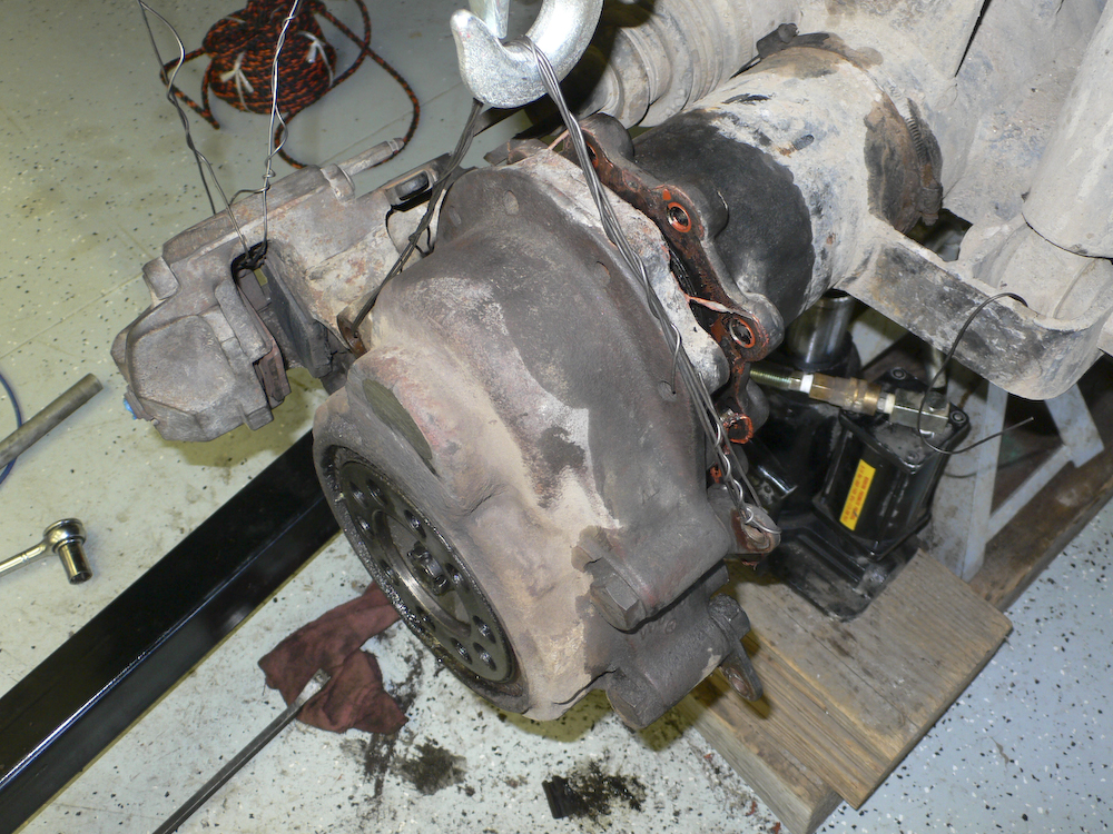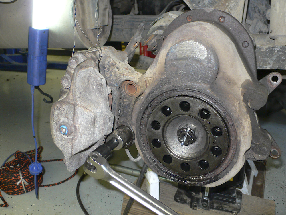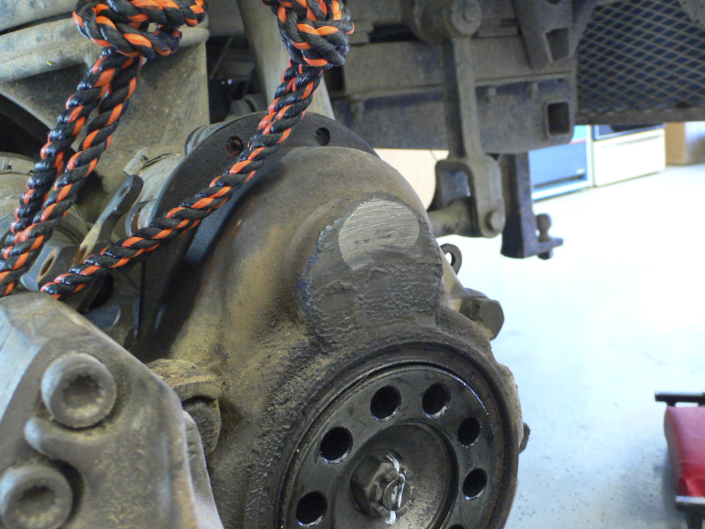 Next, the wheel mount and brake disc was removed. This assembly is heavy, so I used the engine hoist and some rope to insure I did not get a painful surprise on my foot.