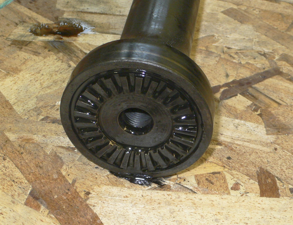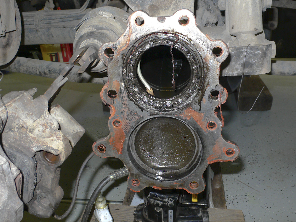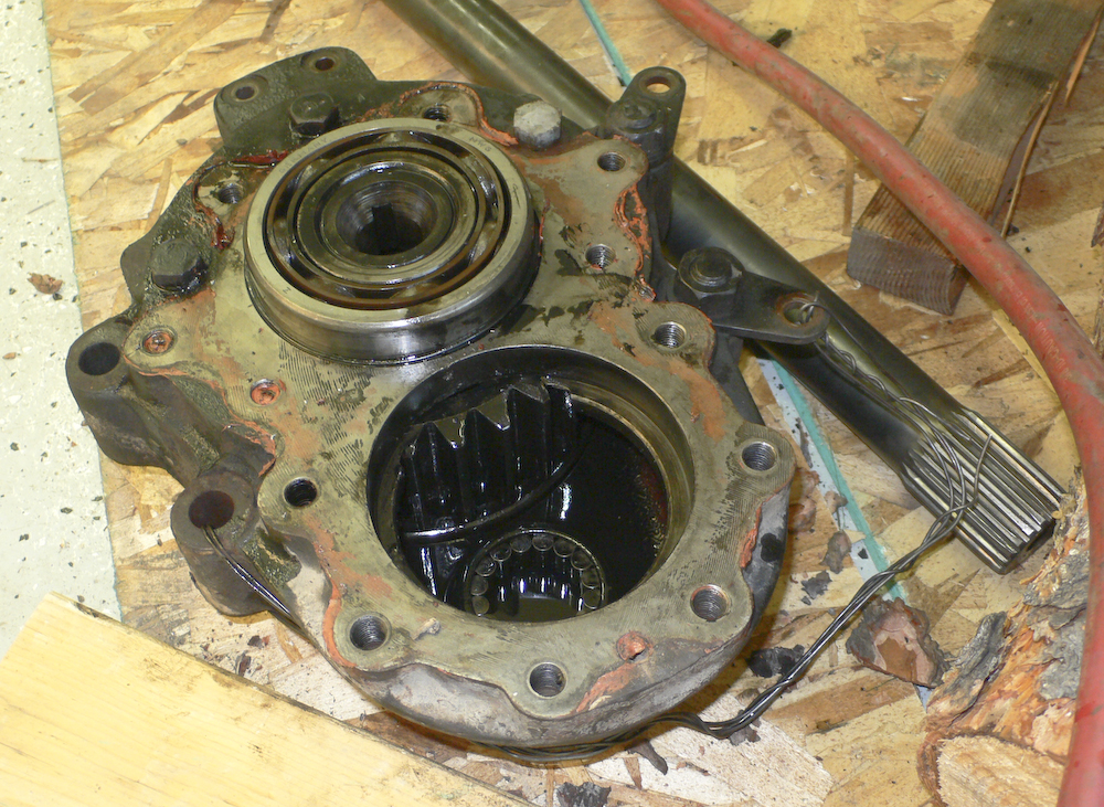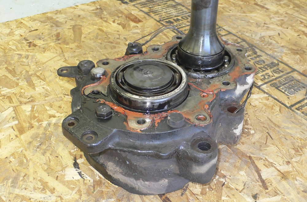 I got it apart, but it was not a pretty sight. The top bearing is fully roasted and metal debris can be seen in the bottom cavity. Dark, burned oil has been vented into the axle tube and has contaminated the differential oil.