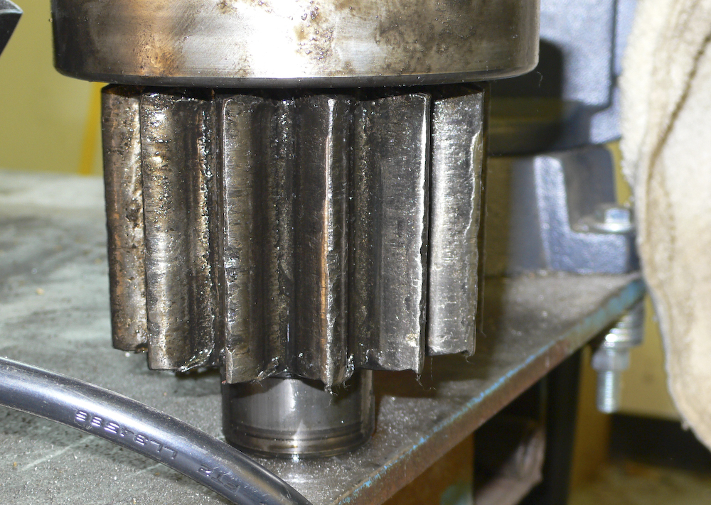 The damage to the wheel gear is not clearly visible, but you can see the rough edges of the gear. Note the nasty black oil that has been burned. Most of the 30 wt oil that I added was burned off during the limp back to Helena.