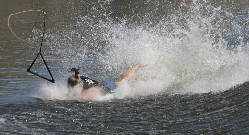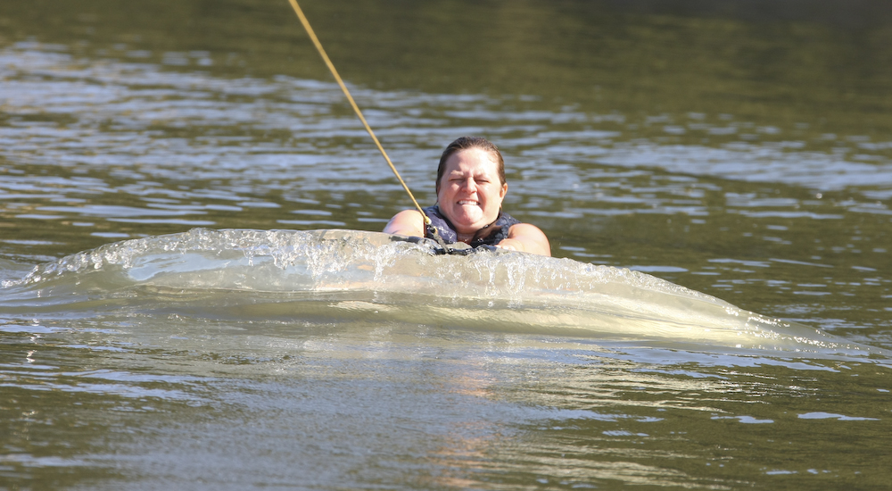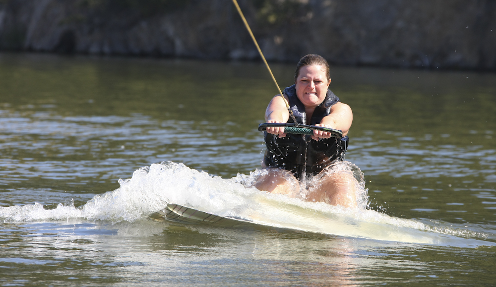 Once we got out into the main channel, Krista set up to wake board. Above, she shows the "concentration face" during the early phase of getting out of the water.