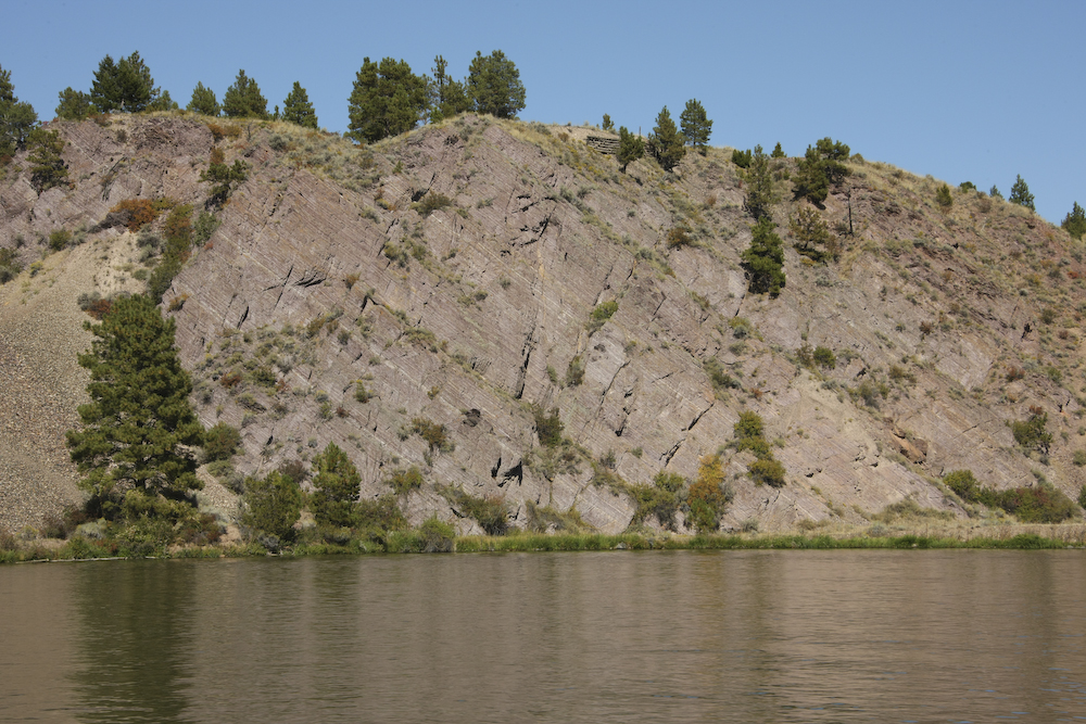 The rock formations that line the lake are dipped due to the uplift and folding that occurred in the area.