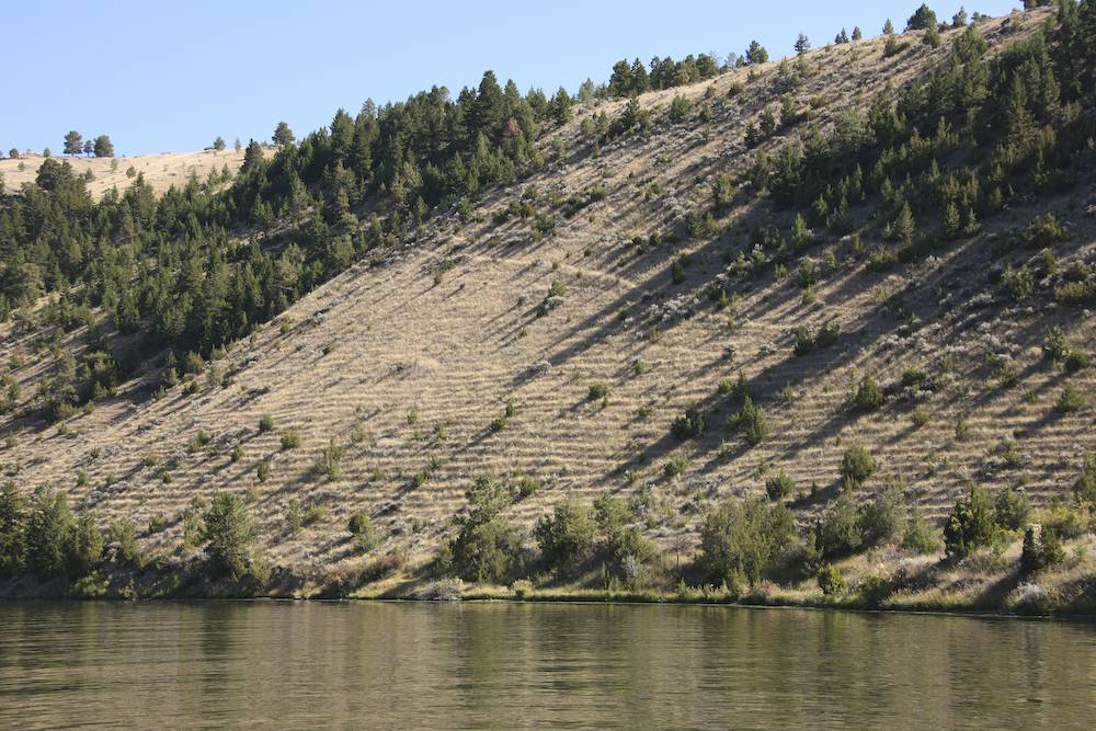 Note the parallel lines in the hillside. These are the result of slumpage of the soil overlaying the rock. Rather like wrinkles on your face, but the time scale is a bit different.