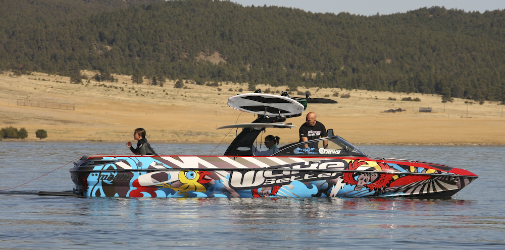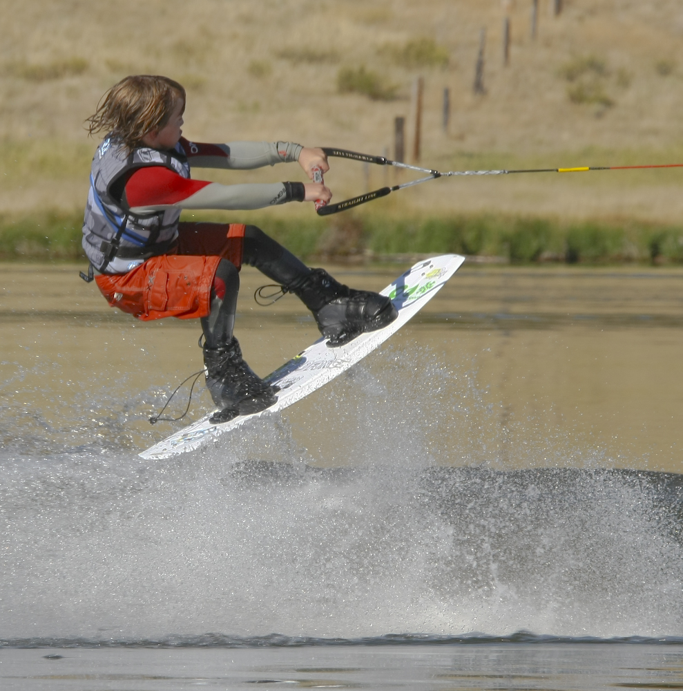 Ben's buddy Simon had a cool boat. He owns the local wake board shop and was out with his wife and kids. We told him that we would be taking some photos of his sons on the wake board.