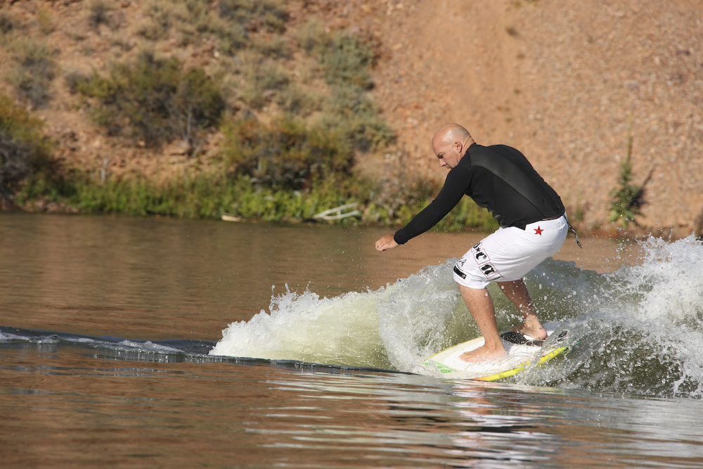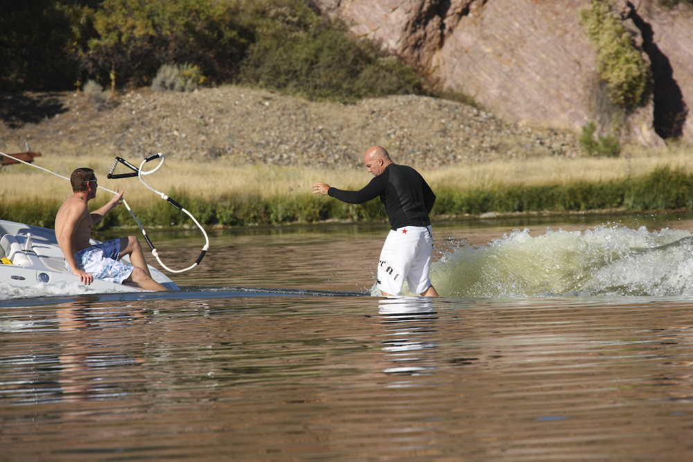 Simon gives it a shot. His board is deep in the wake hole caused by the boat making it look like he is walking on water. Unlike some famous figures in history, I cannot walk on water. I can, however, turn wine into water.
