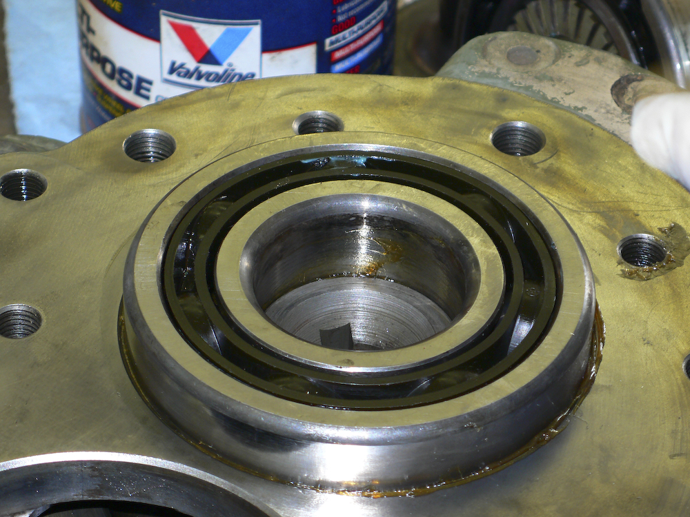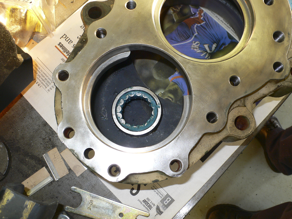 Installing the outer roller bearings. Note the plastic retainer on the rollers that will naturally come off as the bearing is pressed into place. Don't make the mistake of pulling the retainer too soon as you will have a hand full of rollers on the floor! I did not do this, but I was advised that it would be a bad thing to do.