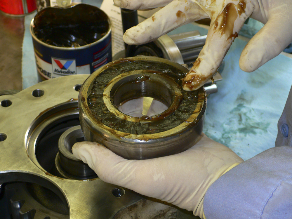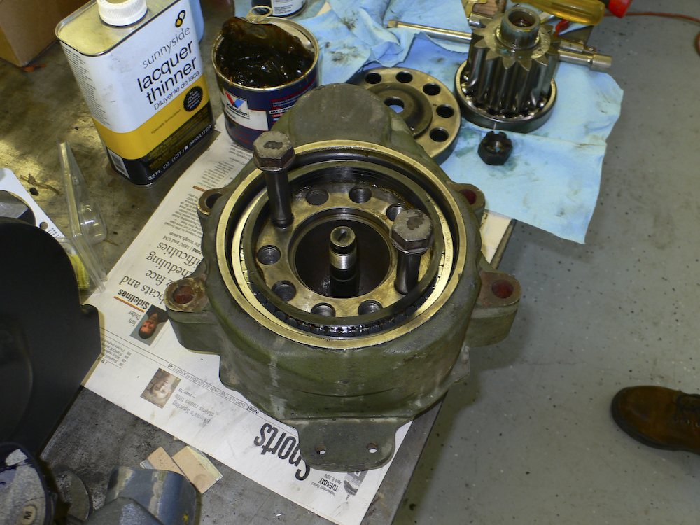 The bad news. Upon cleaning and subsequent inspection, I discovered that the large bearing on the wheel gear had fused to the gear and the bearing had spun inside the casting wearing a deep grove in the casting and rendering it scrap. The shiny surface above should be smooth and flat, but now it has a groove and a lip. Rob was able to find an appropriate casting and sent it overnight as well.