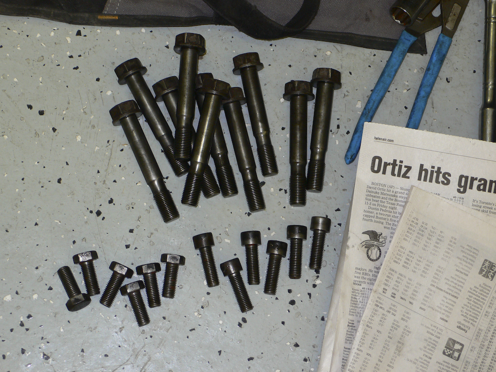 The array of bolts require to make the assembly possible. The long bolts hold the hub to the wheel and brake rotor.