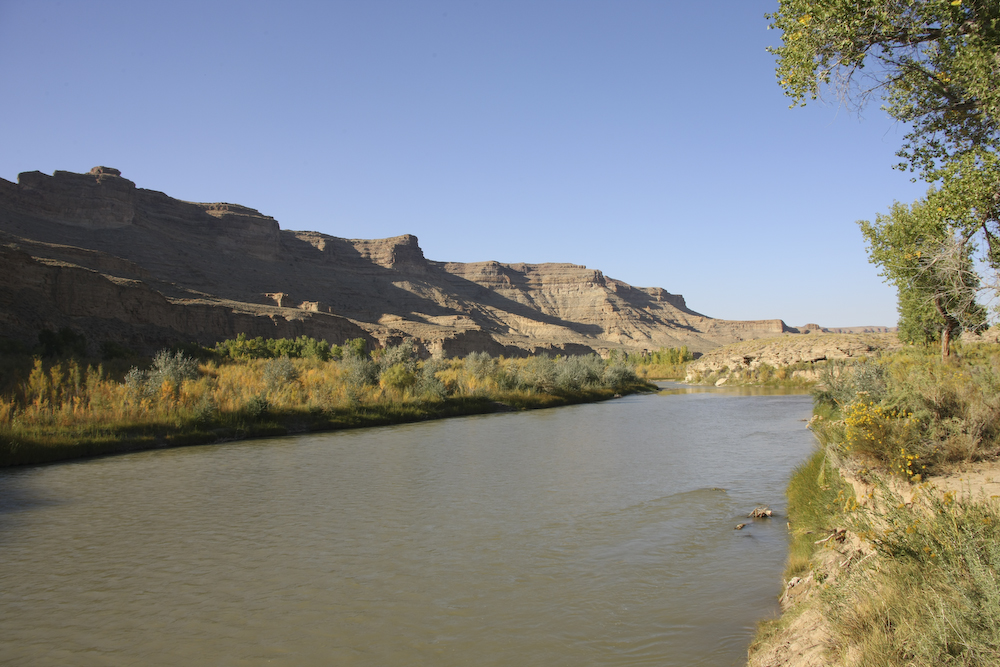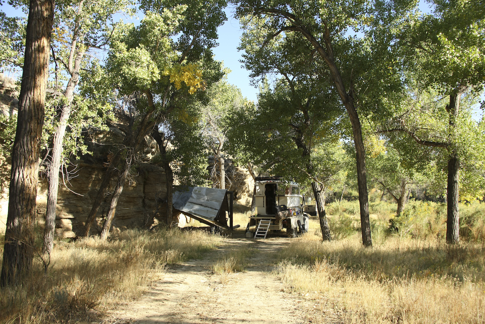 We followed the trail to a nice copse of Cottonwood trees in a flood plain of the White River. The structure to the left of the mog is an abandoned "cowboy camp". They had some logs and aluminum roofing to provide a semi-sheltered are. The construction was "totally Jed" as can be seen by the fact it is no longer standing. Plus, using typical Jed reasoning, the location they chose is in a low spot so the water accumulates when it rains.