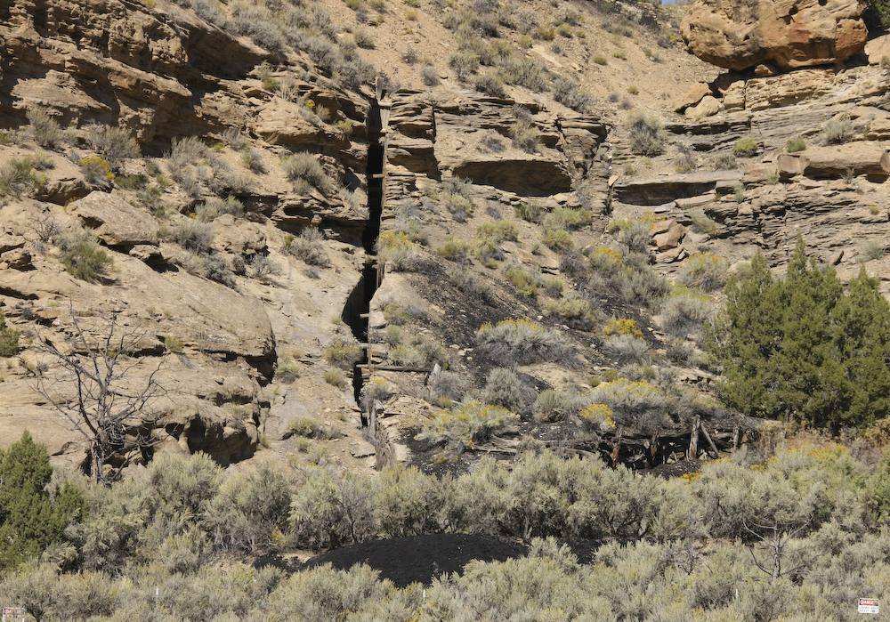 Our path south took us through Asphalt Wash and into some areas that were mined years ago. Above is a test-dig for coal and tar sands that was right by our path. Note the black pile in the foreground. The sign at the bottom says "Danger: Caving Area. Keep Out". Enough said for me. We moved on.