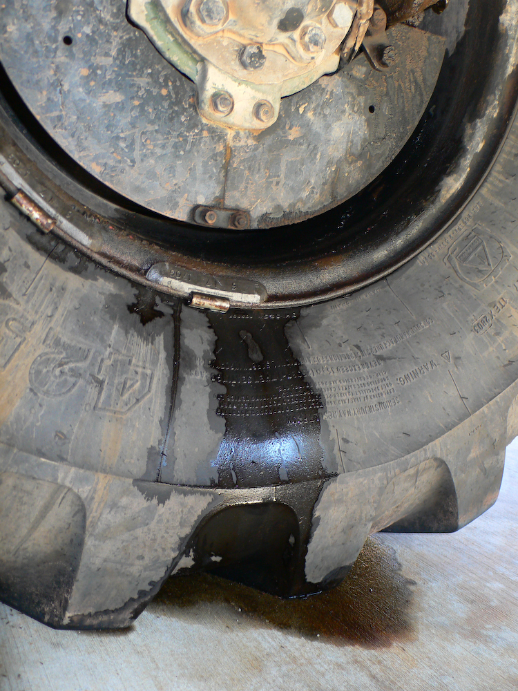 Strikes with the duck-billed tire sledge-hammer were required to get the tire seated. Once the tires were on the rim, ether and a match were used to seat the bead. These tires "want" a 10" rim and the 1300L rims are 11". They will work, but only if the air pressure is kept at 1 bar or above. Below that, the tires have a tendency to de-bead and fall off the rim.