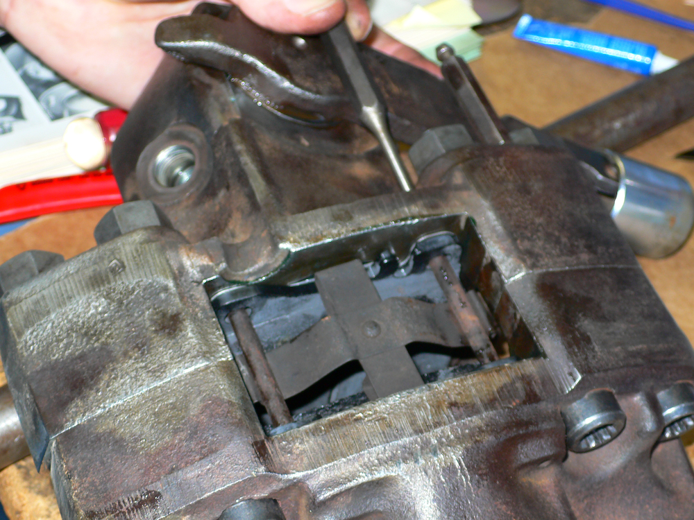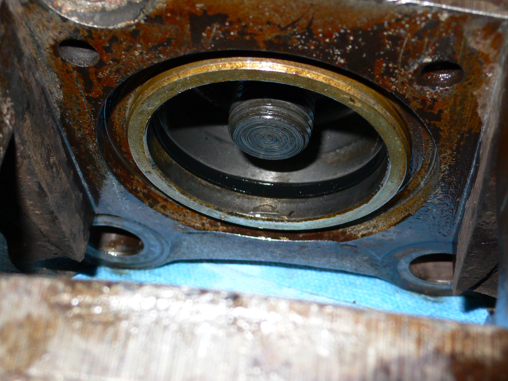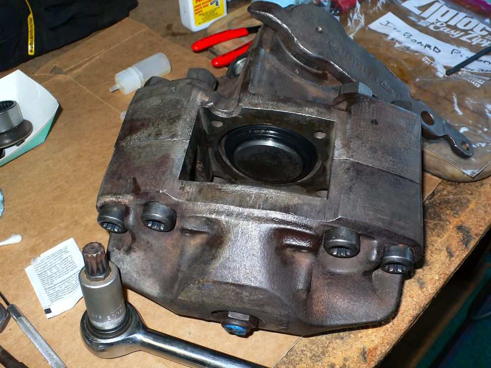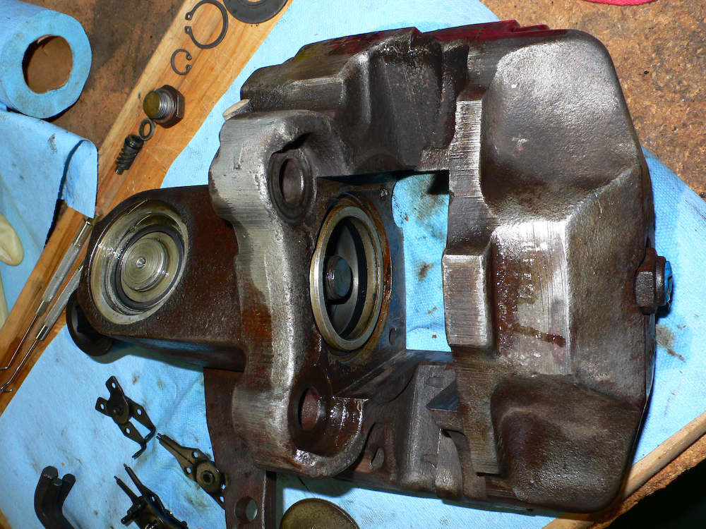 Based on speaking with several fellow owners, I was proceeding under the mistaken assumption that I could effect a repair without cracking apart the halves of the housing. After many tries, it was clear that was impossible. Taking the halves apart requires new bolts and gaskets. The bolts are needed because they are tightened to the point of plastic deformation and are therefore permanently stretched. One more call to Jim Ince and I had what I needed to effect the repair. Visible in the photo above is the cylinder for the brake piston, the piston seal (black ring) and the adjustment screw that positions the piston against the disc.