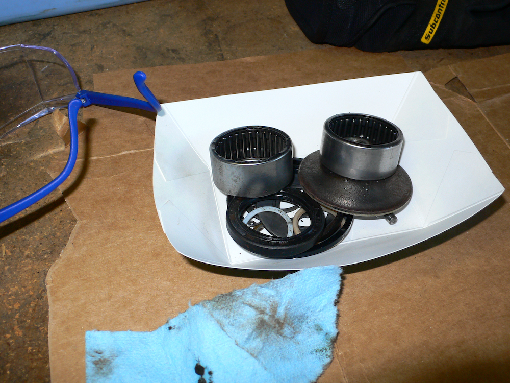 The spent parts from the repair: 2 needle bearings from the parking brake actuation lever, seals, plugs and snap rings. All these parts were in the repair kit.