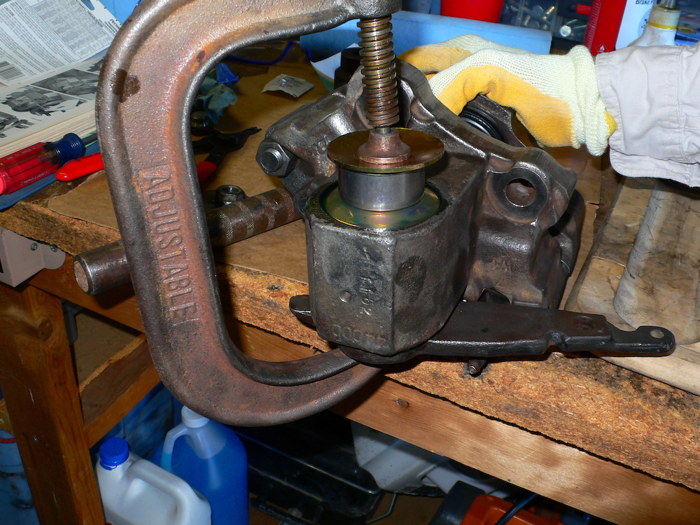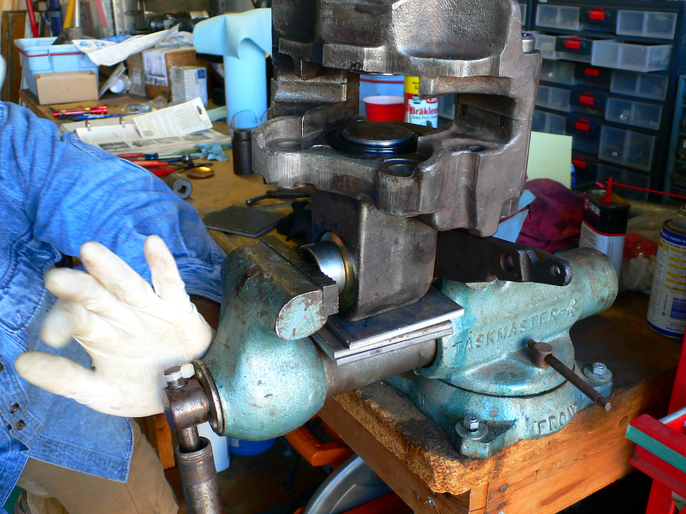 Once the halves were together, the brake lever was reinstalled. Then, the cover plug was pressed into the housing. But, the clamp was not beefy enough to fully complete the job.