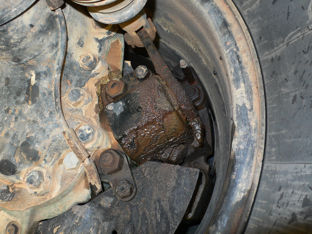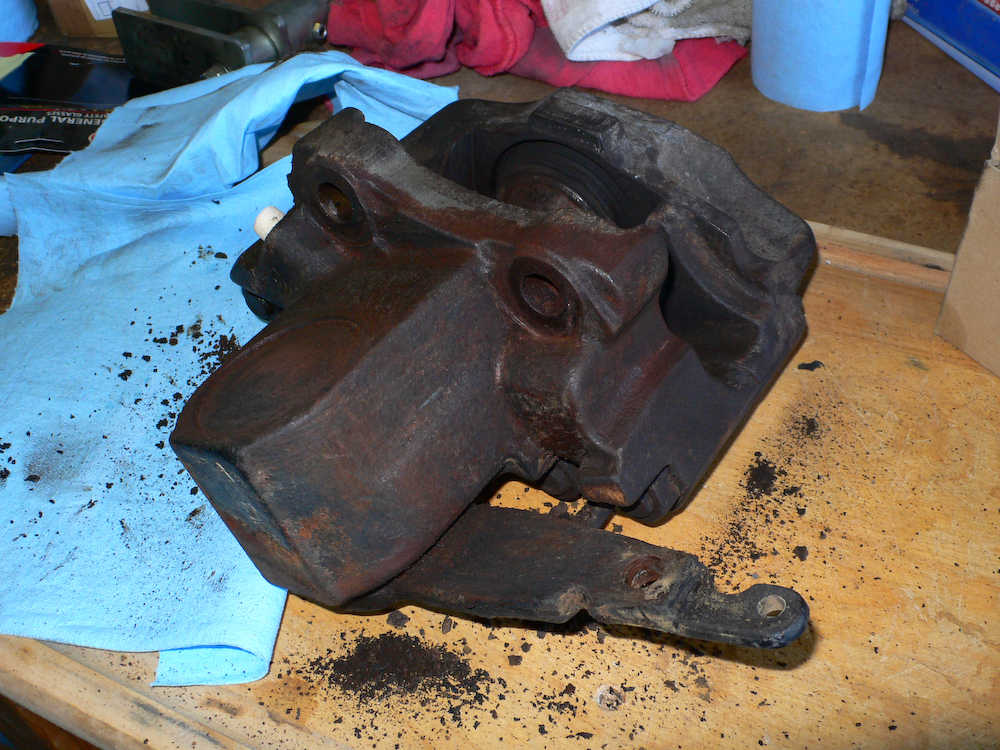 A was smart when I reinstalled the brake assembly after the last failure - I used anti-seize on the body bolt. So, removal was duck soup. Once the hydraulic line was disconnected, the assembly was put on the bench for inspection. This guy was filthy and a good cleaning was in order before proceeding any further.