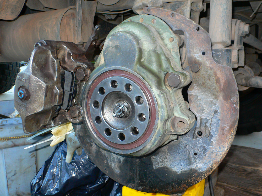 The brake assembly was cleaned and installed on the hub. Note the rubber glove under the assembly - it was the cover for the brake line. Also note the new, clean oil seal on the hub. This was replaced as part of the failed wheel bearings.