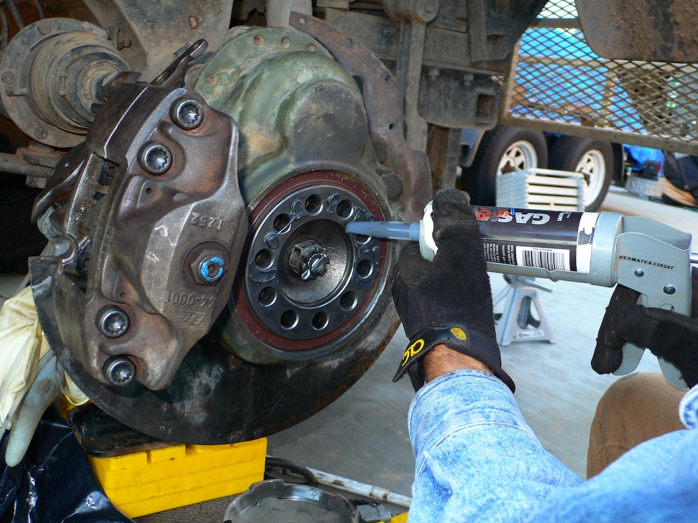 Before the brake disc was reinstalled, I coated the wear ring with Perma-tex gasket sealer to keep the assembly from seeping.