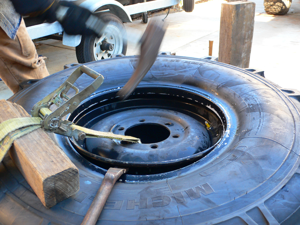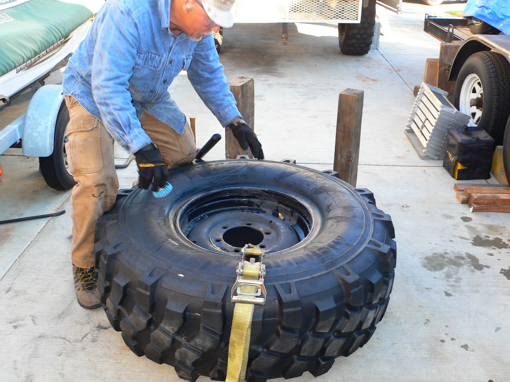 After the brakes were completed and road-tested, it was time to have a tire rodeo. These tires are ex-military 395/85R20 rubber that were only $150 per tire with about 90% tread. Shipping was extra, but I got 4 tires delivered to my door for less that $1K. This was in contrast to the $1K per tire for new XM-47s. Above, we get ready to get the second side of the tire on the rim using dish soap as the lubricant. The ratchet strap was used to keep the tire from slipping around