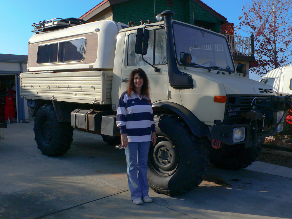 The finished product. Two sets of brakes, removing 4 tires and mounting 4 bigger tires. Not a small amount of work. Above, Kathleen stands next to the truck so you can judge the height of the full assembly.