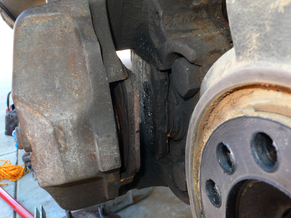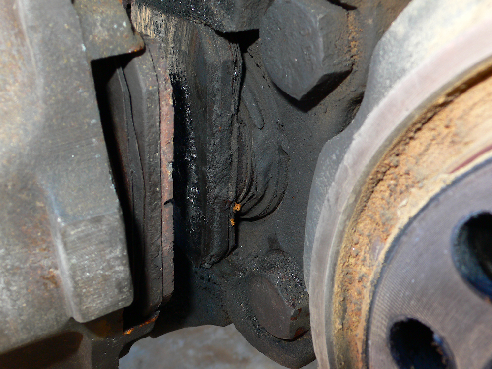 A close-up of the pad shows several things. First, the pads are toast. Second, the dust seals on the pistons are toast as well. Time to get new parts.